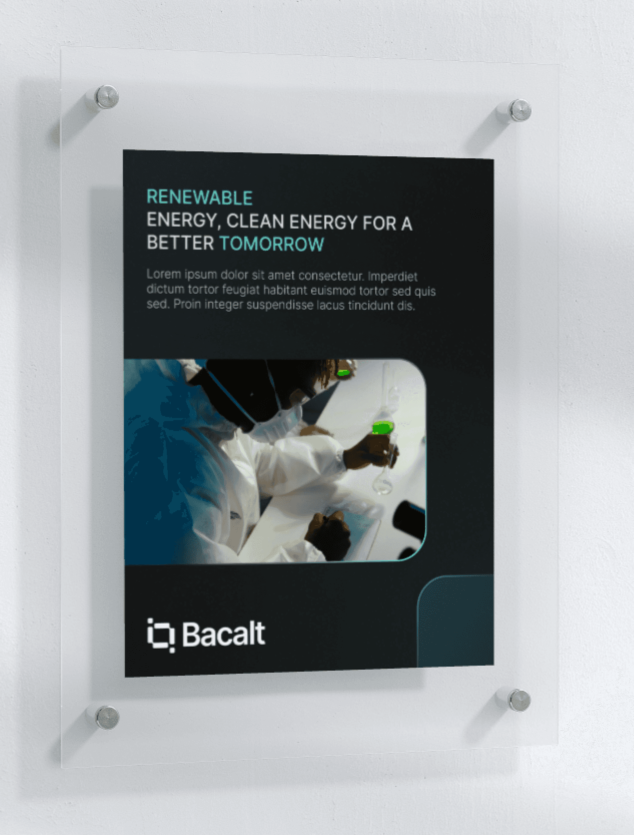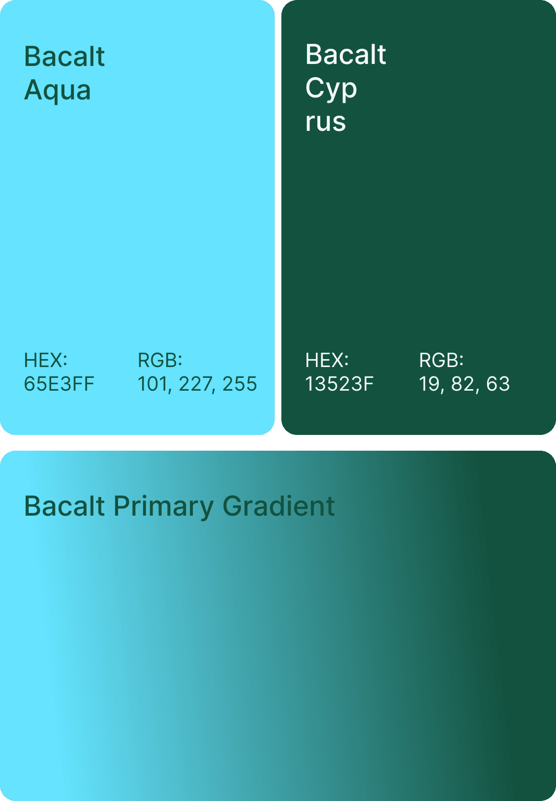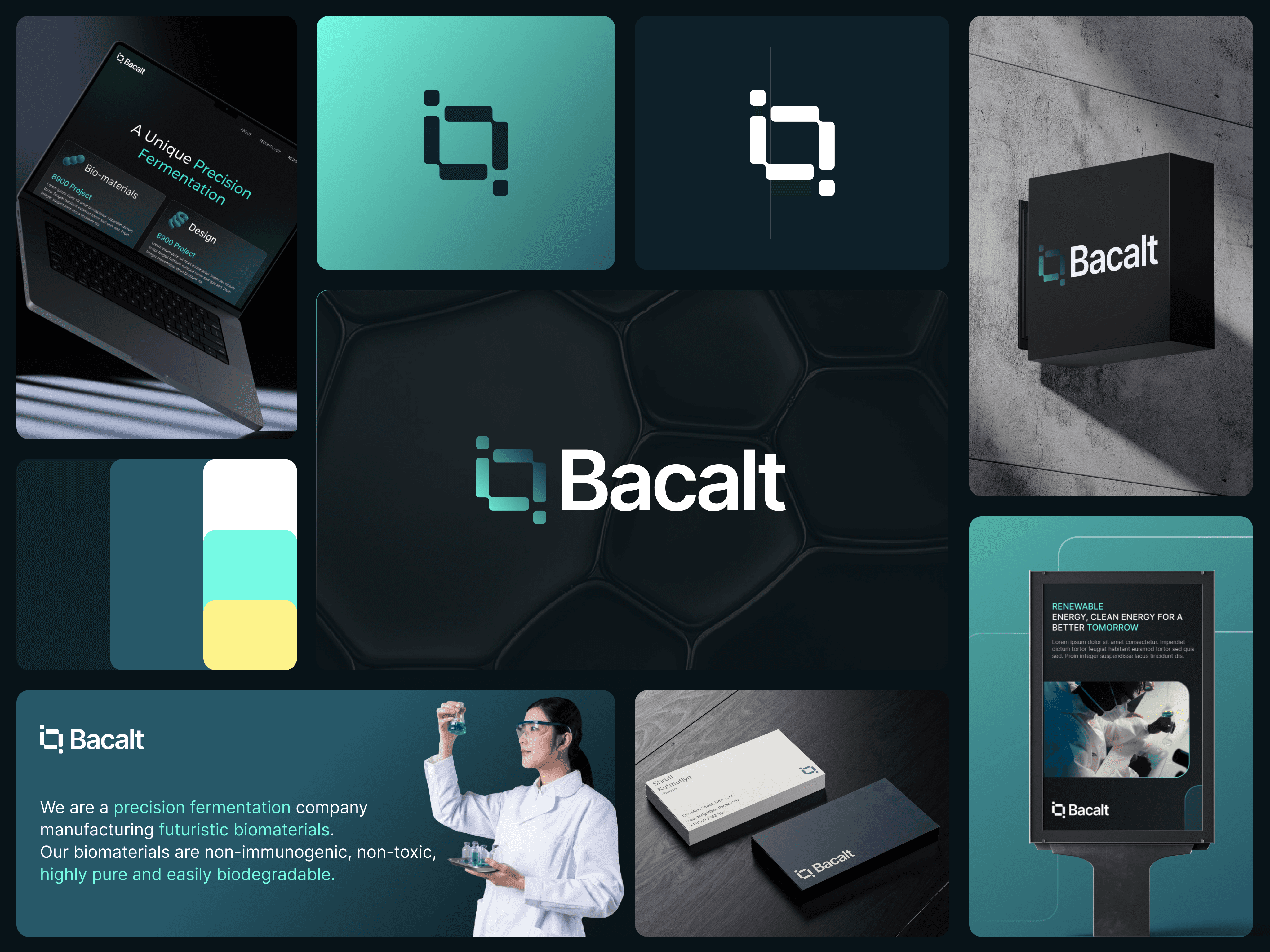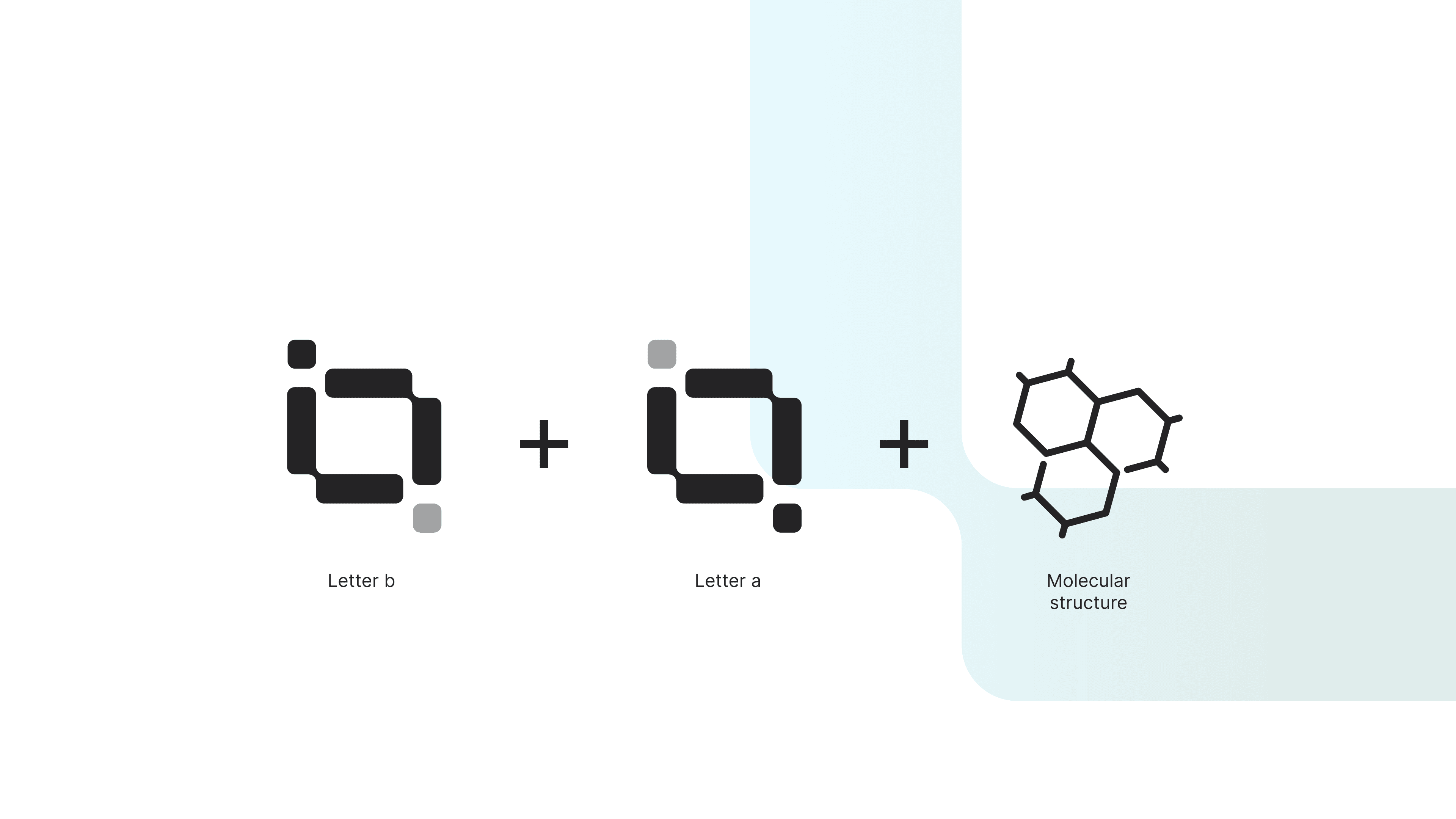 Our mark is derived from the letters “b” and “a” combined with a simplified molecular lattice, forming an open square with four active nodes. This shape hints at petri-dish corners, linked monomers and a lab window. The final system pairs this four-node mark with a clean wordmark in Carbon Black, using a BacAlt Aqua to Cyprus gradient for the symbol. Rounded corners keep it human, the grid keeps it precise, and the lockup scales cleanly across vials, slides, decks and the web.