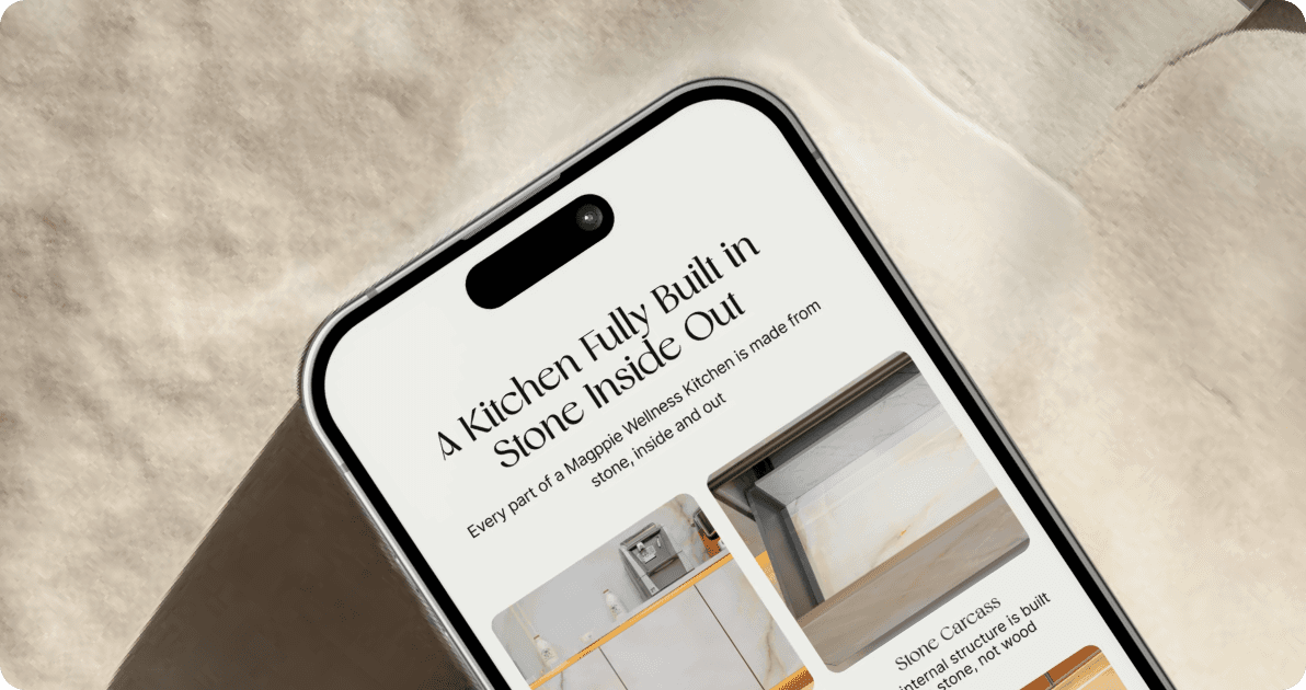 We created a calm, modern UI/UX for Magppie that reflects their stone-built craftsmanship and wellness-grade engineering, highlighting their 100% stone innovation and celebrity-trusted credibility to communicate trust and quiet luxury.